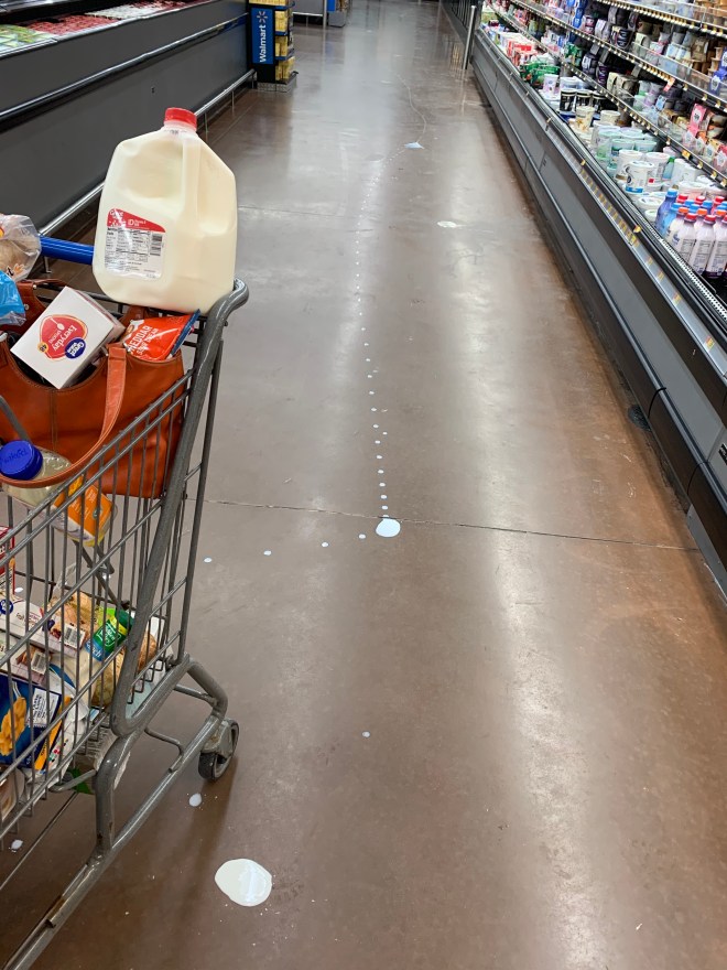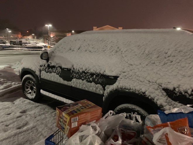 Late night shopping trips are great if you don’t make a huge mess all down the dairy isle and come outside to find your vehicle has been enduring a blizzard.