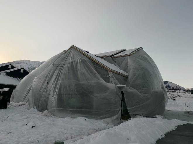 It’s like a big tease. We keep going down south to see the house, only to find it tented like a big present. I can’t wait to see it completed.