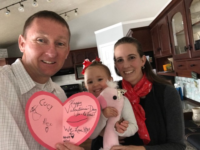 “Holidays” are a bit crazy around here when they fall on a school day. The big kids grabbed their Valentines and headed out the door to school before we knew what was happening. Lucy had her own Valentines to deliver, and wanted to be the one to give Uncle Eric his.