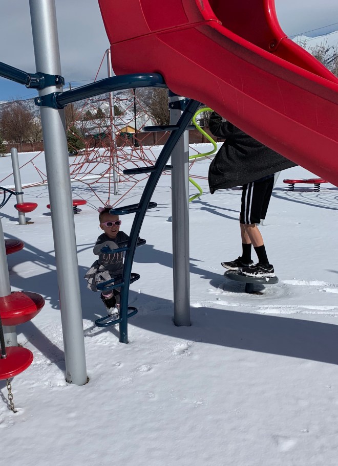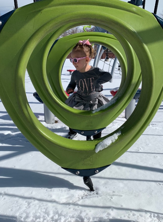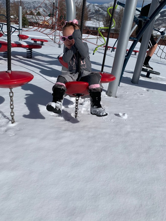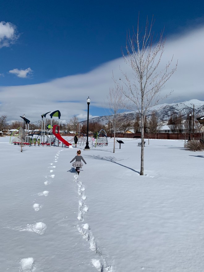 Nothing is more exciting than to be the first person to leave tracks across newly fallen snow. Lucy has been begging to go play at the park. Of course we keep telling her that she is crazy!