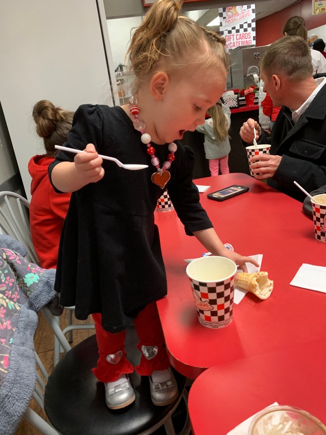 Lucy delivered a lot of Valentines to her friends throughout the day. But her most special one came last. She had to wait a while for him to get home, so we went on our way to get custard with Uncle Eric.