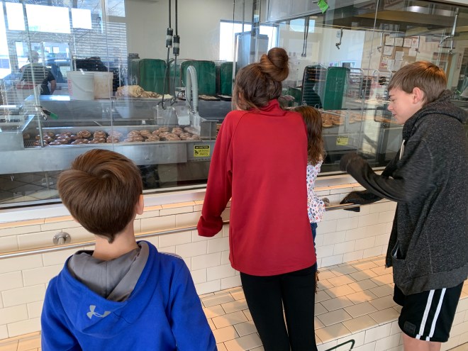The kids always love to watch the donuts get made at Krispy Kreme’s! They like to see if any go through the wrong way, or get smashed too.