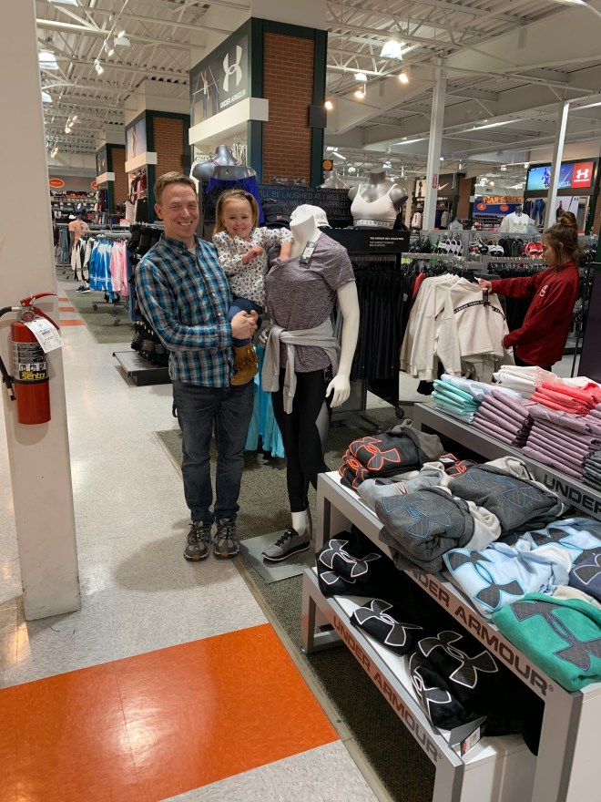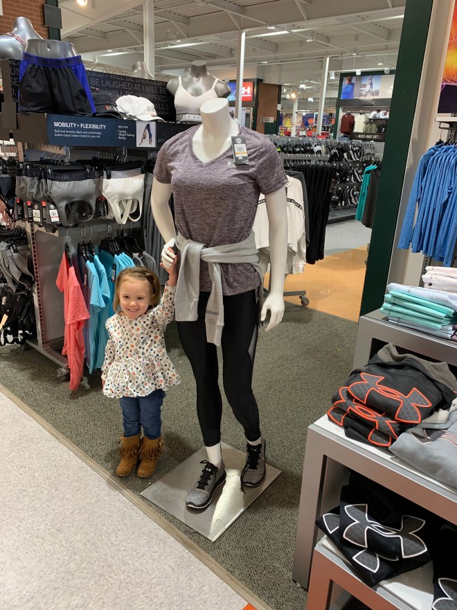 After breakfast, we went and killed time at Dicks Sporting Goods. William is in love with one of their little BMX bikes, so he wanted to go test it out again. Lucy has this weird obsession with department store mannequins. She thinks they are all her friends, and has to hold their hands.