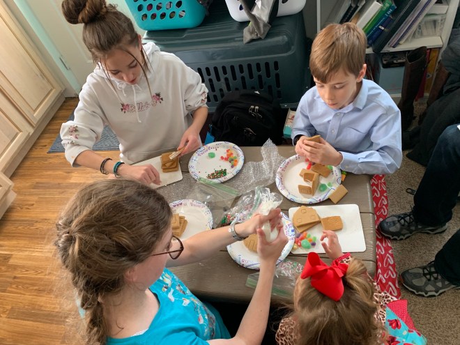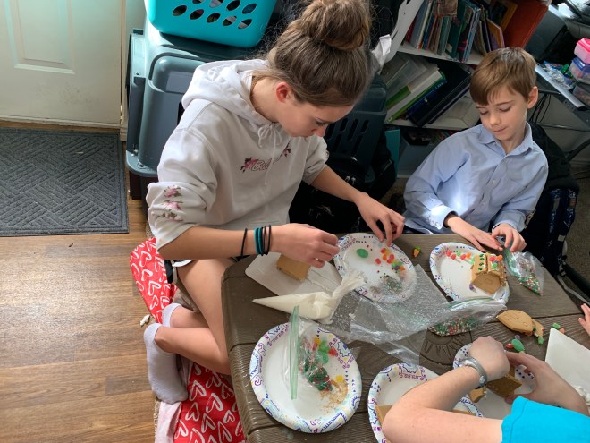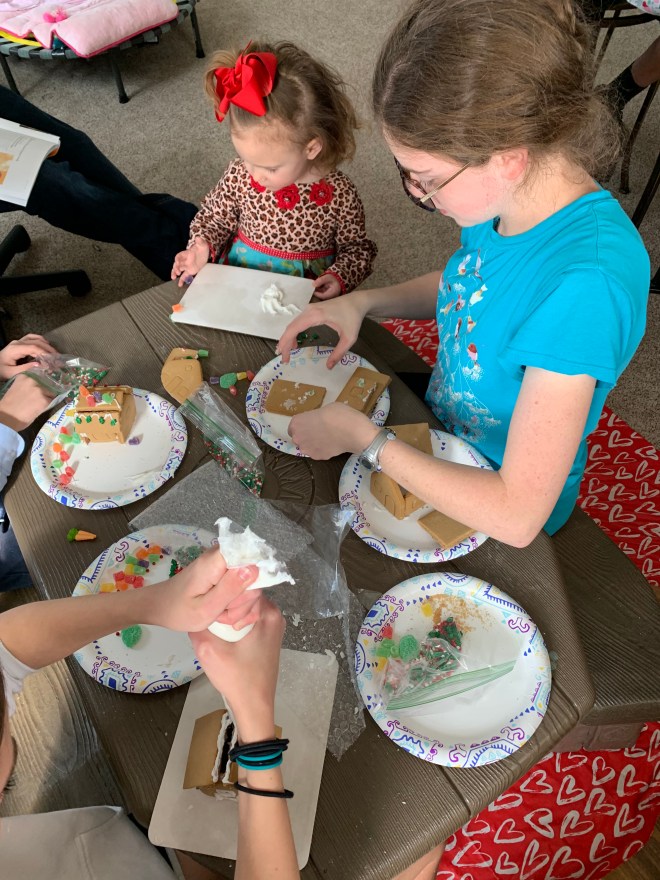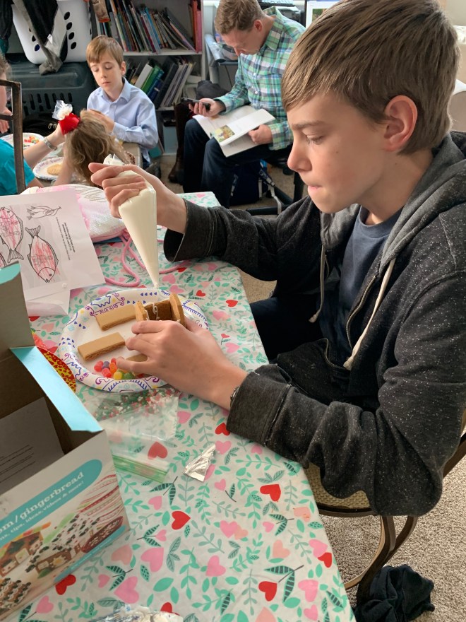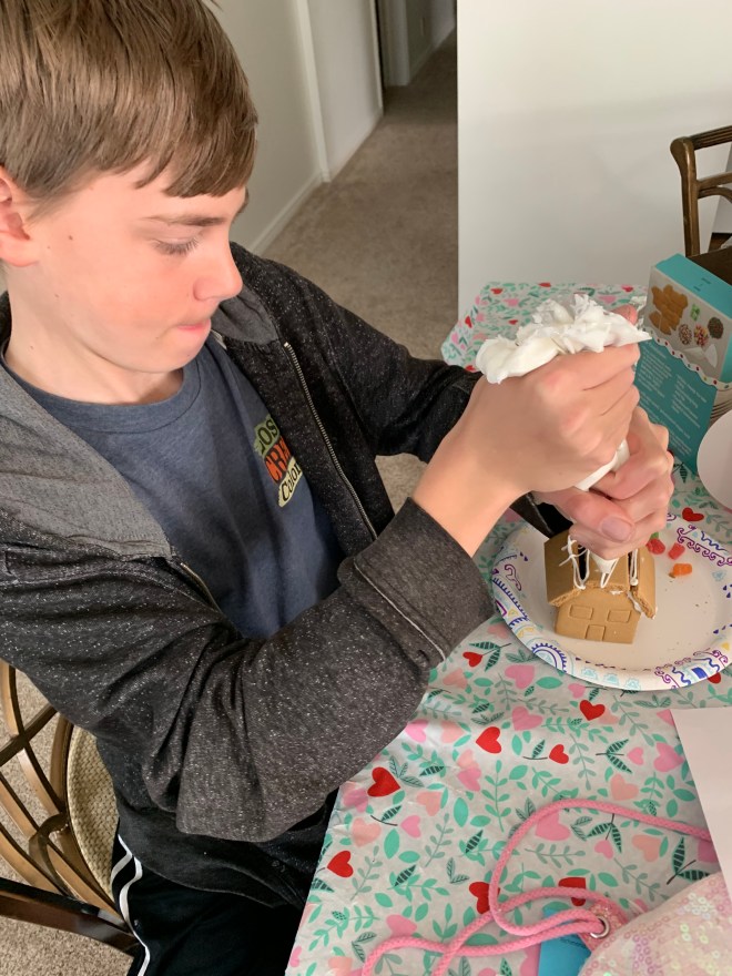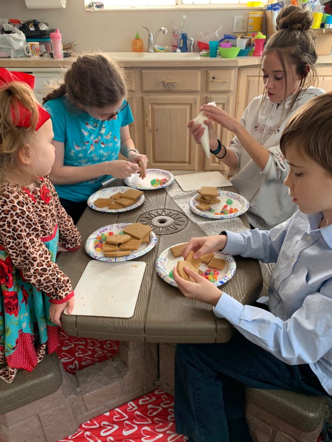 Since Christmas was such a bust with the flu, I didn’t dare have the kids do our gingerbread houses. So, I figured we could make Valentine houses instead, now that everyone is much better.
