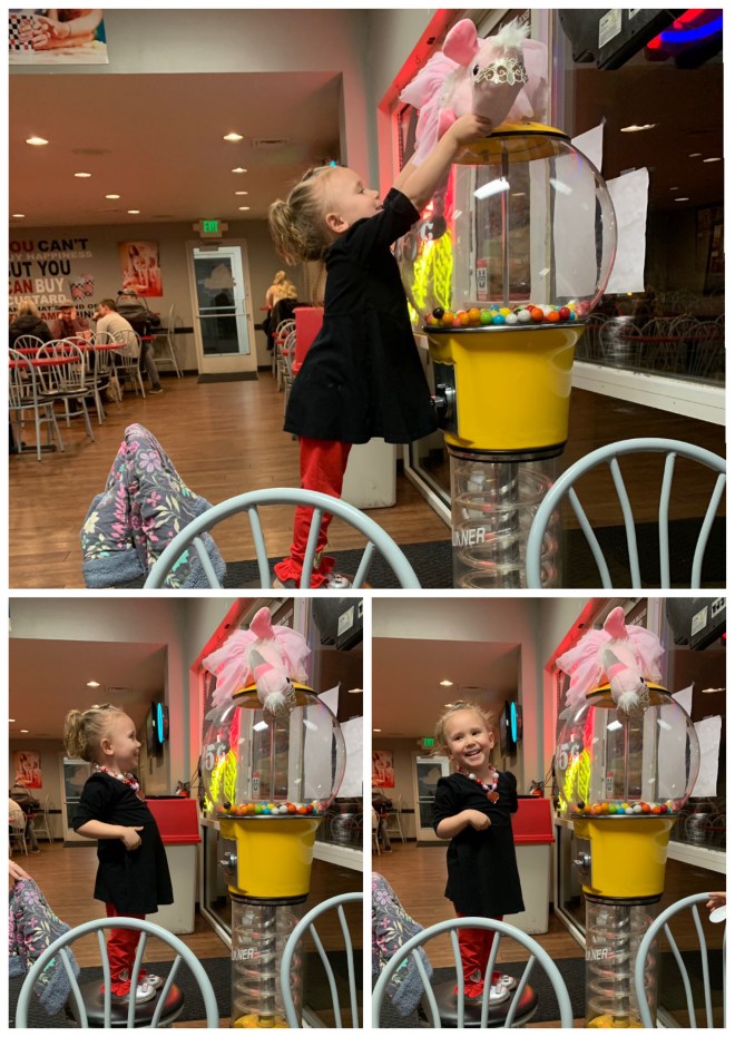 Lucy decided that Flamingo liked climbing to high places, and wanted to be on top of the bubblegum machine. She thought it was so incredibly funny.