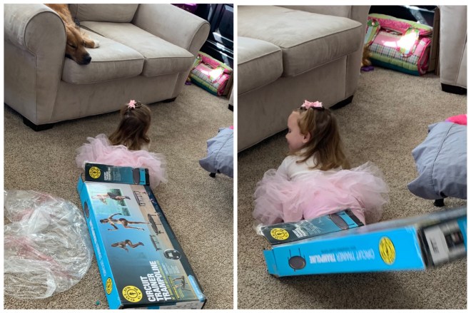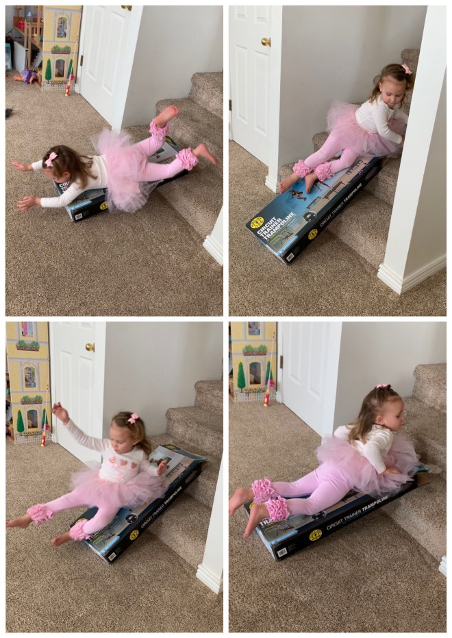 She continued to slide down the stairs on her “tail” for over an hour. Yep, what they say about boxes is true! “Give a kid a box, and they’ll be entertained for hours.”