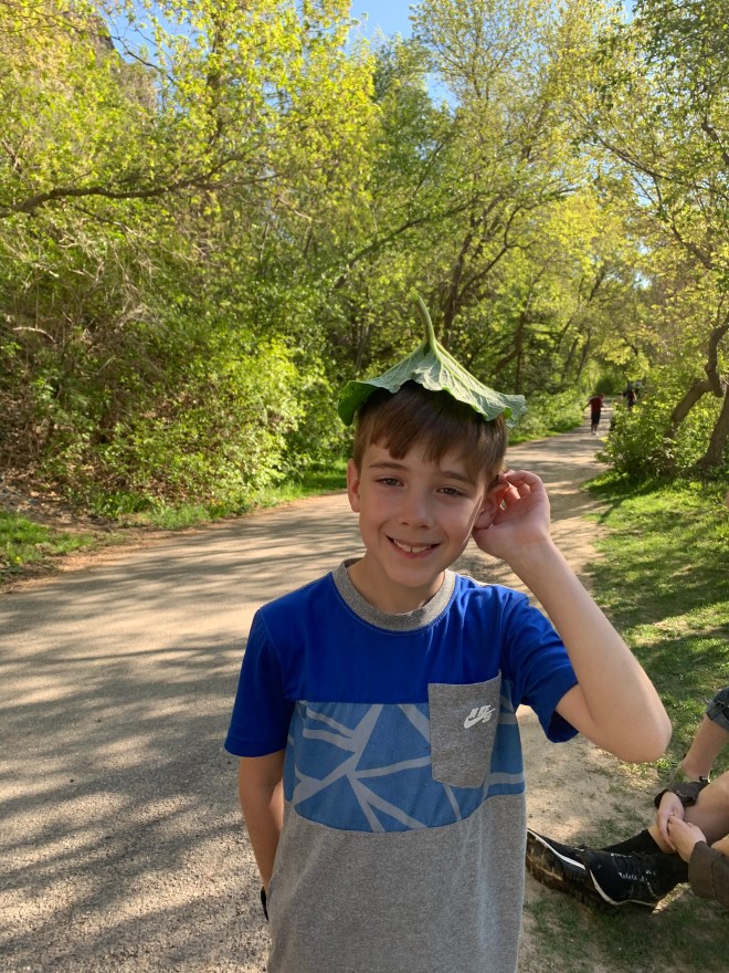 Alex found some large leaves along the path back to the car. He looked like the leaf men from Epic.