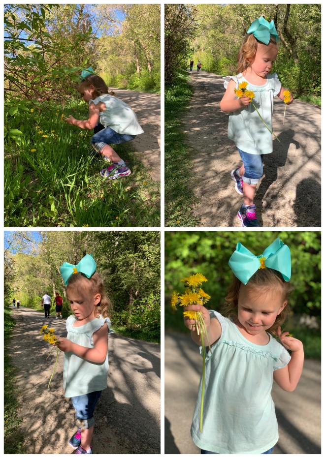 Lucy wouldn’t quit picking every dandelion she saw. It was making me nervous because she kept sticking her hands and all random parts of the woods. I was terrified for poison ivy, snakes, or spiders. Finally when she grabbed one in a spider’s web, she quit. She was super sweet with them though, and had to share them.