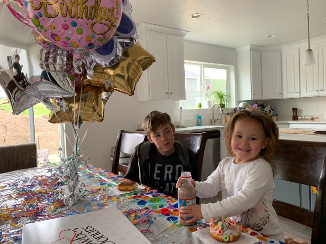 I brought home special birthday donuts from Cowboy donuts, since we will have birthday pancakes another day. Lucy was so super excited to see fruit loops on her donut. (Oh boy, I hope we won’t all pay for this later!) I cannot believe our little munchkin is 4!!! already!!! This time has gone by so very fast. Lucy loves that she is getting older, but I don’t like it at all. Today she was telling me and William about all the things she can do now that she is 4. She’s taller. She’s faster. She has gained new super powers, like “extra super star vision.” And… the killer of the day…